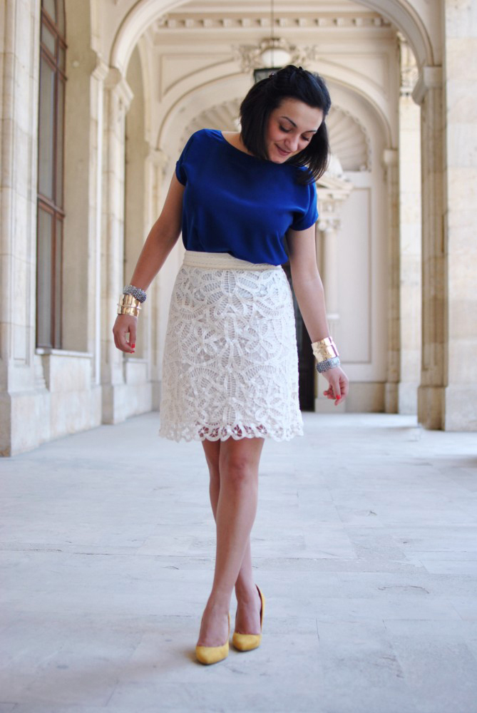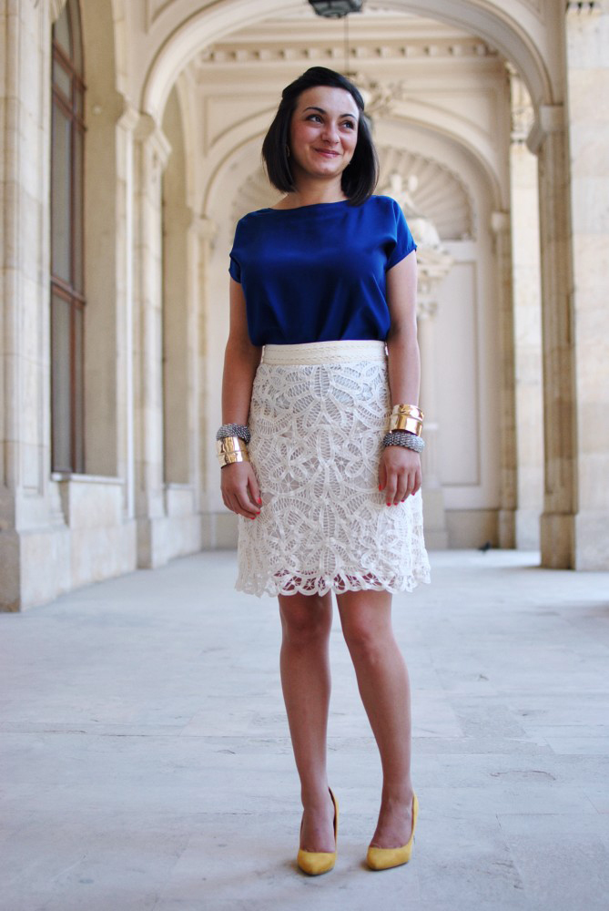 lovely! from head to toe! that electric blue satin top works great with the lace skirt and then the mustard pumps complementing the blue of the shirt so well!!! oh yeah and those bracelets shake it all up so well 🙂